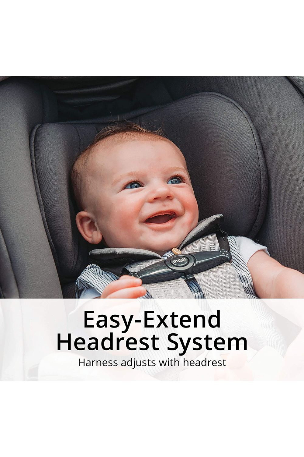 Sistema de reposacabeza EASY-EXTEND: De 5 posiciones que se eleva con el arnés para acomodar el crecimiento de hasta 81 cm de altura, lo que le permite mantener a su pequeño en el mismo asiento de seguridad orientado hacia atrás durante más tiempo.
