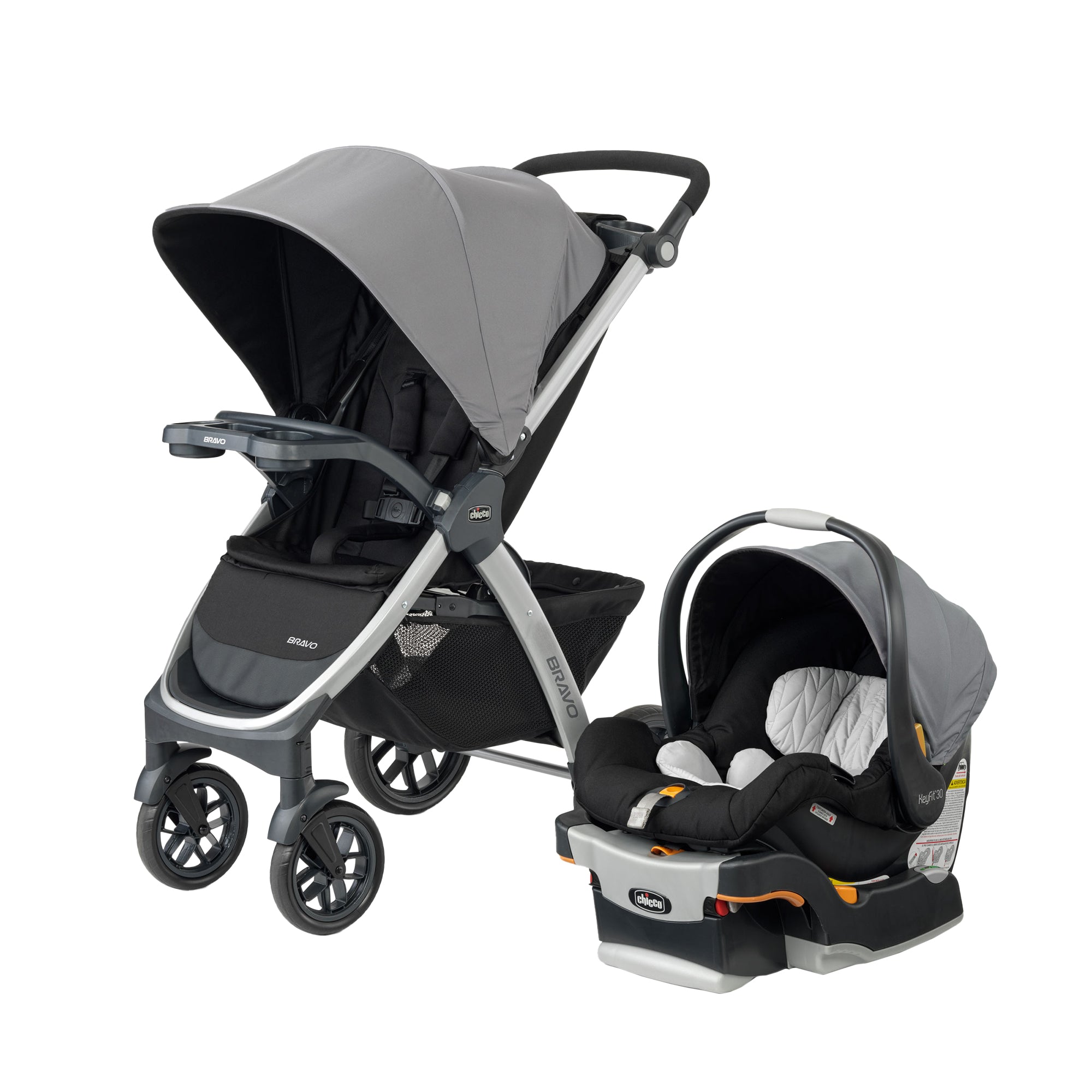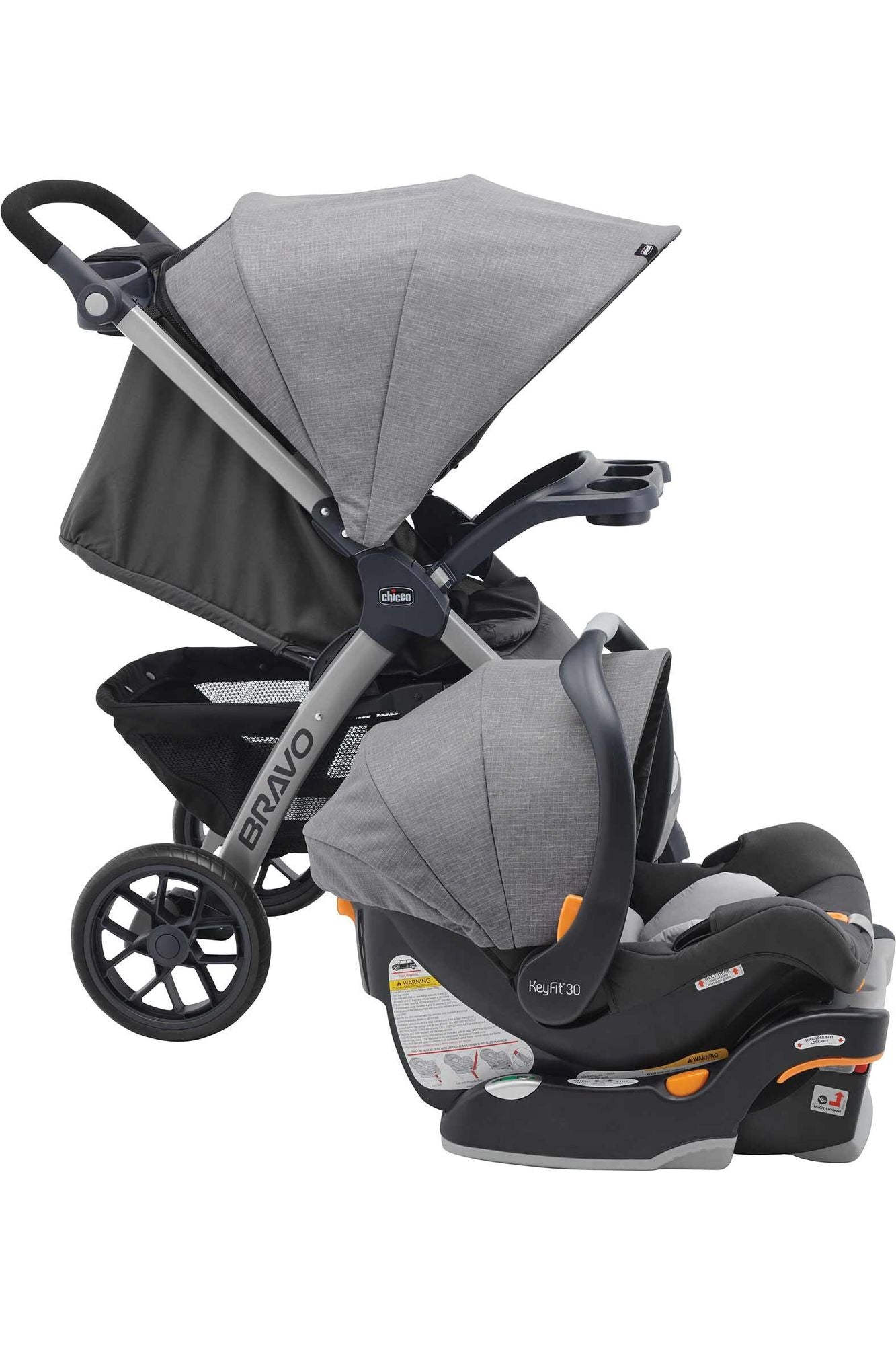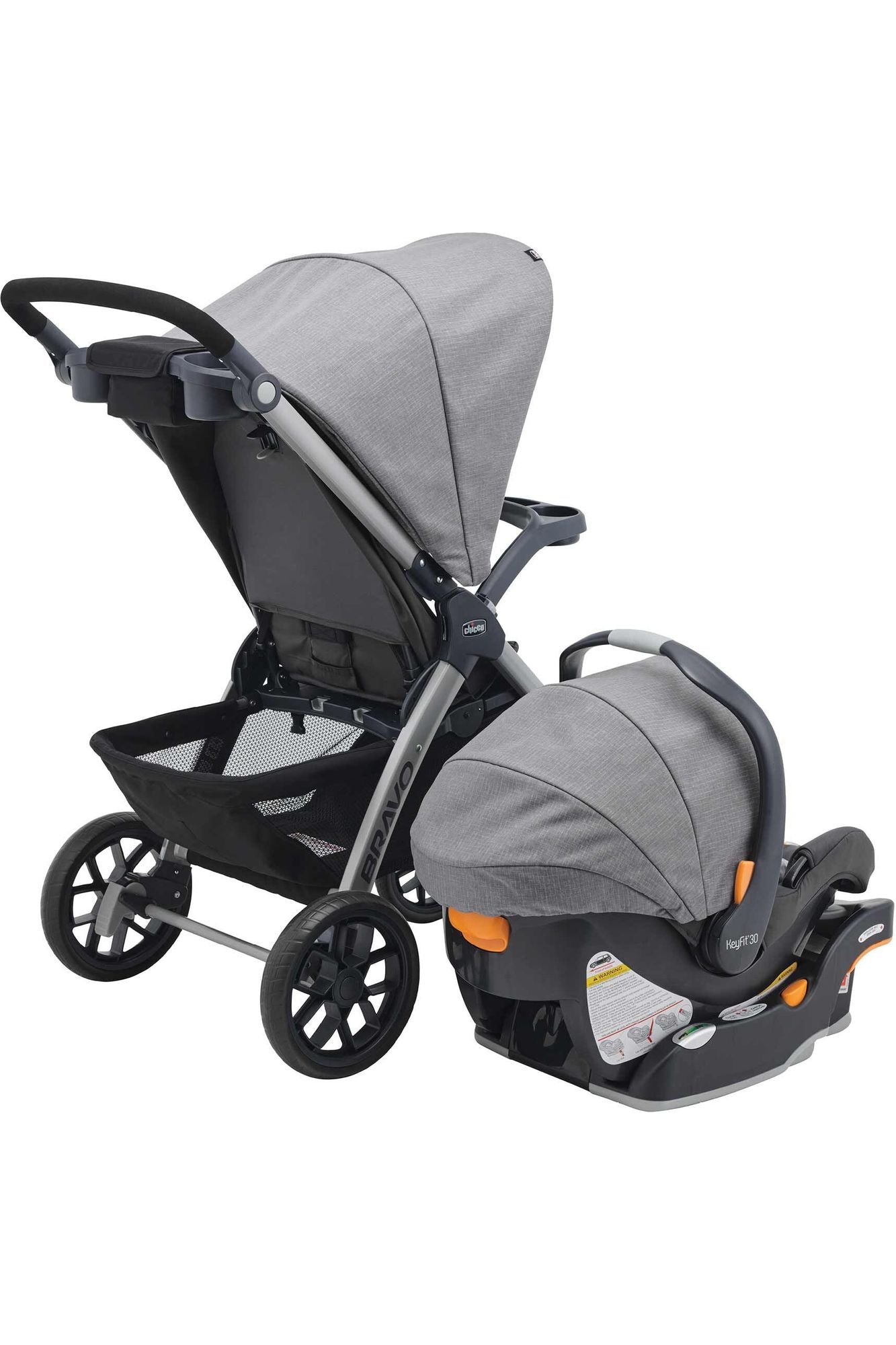 Portabebé KeyFit30: en su primer modo de uso con bebés, Bravo funciona como un porta Autoasiento, cuenta con base con Sistema Latch para anclar al automóvil. Es muy fácil retirar el asiento y la capota de la carriola para conectar el KeyFit al adaptador, haciendo un sonido de clic.